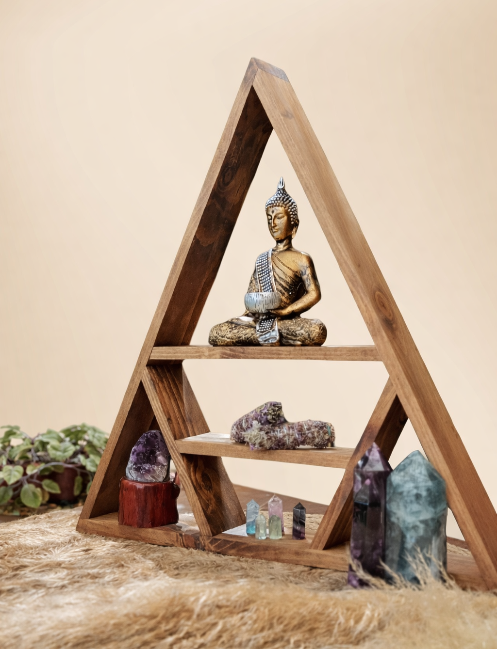 Cada nivel del altar actúa como un plano de integración: lo visible y lo invisible, lo material y lo sutil, lo cotidiano y lo ritual. El Altar Anclaje sostiene aquello que eliges honrar —cristales, símbolos, libros, figuras, intenciones— convirtiéndose en un punto de equilibrio energético dentro del hogar.