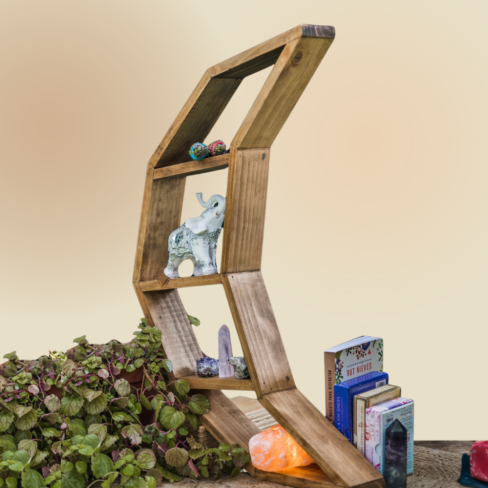 El Altar Lunar honra la energía sagrada de la Luna y sus ciclos eternos de cambio, recordándonos que todo en la vida se transforma y renace. Su diseño en forma de media luna representa la intuición, la creatividad y la sabiduría femenina, actuando como un símbolo de conexión con los ritmos naturales del cuerpo, la mente y el alma.