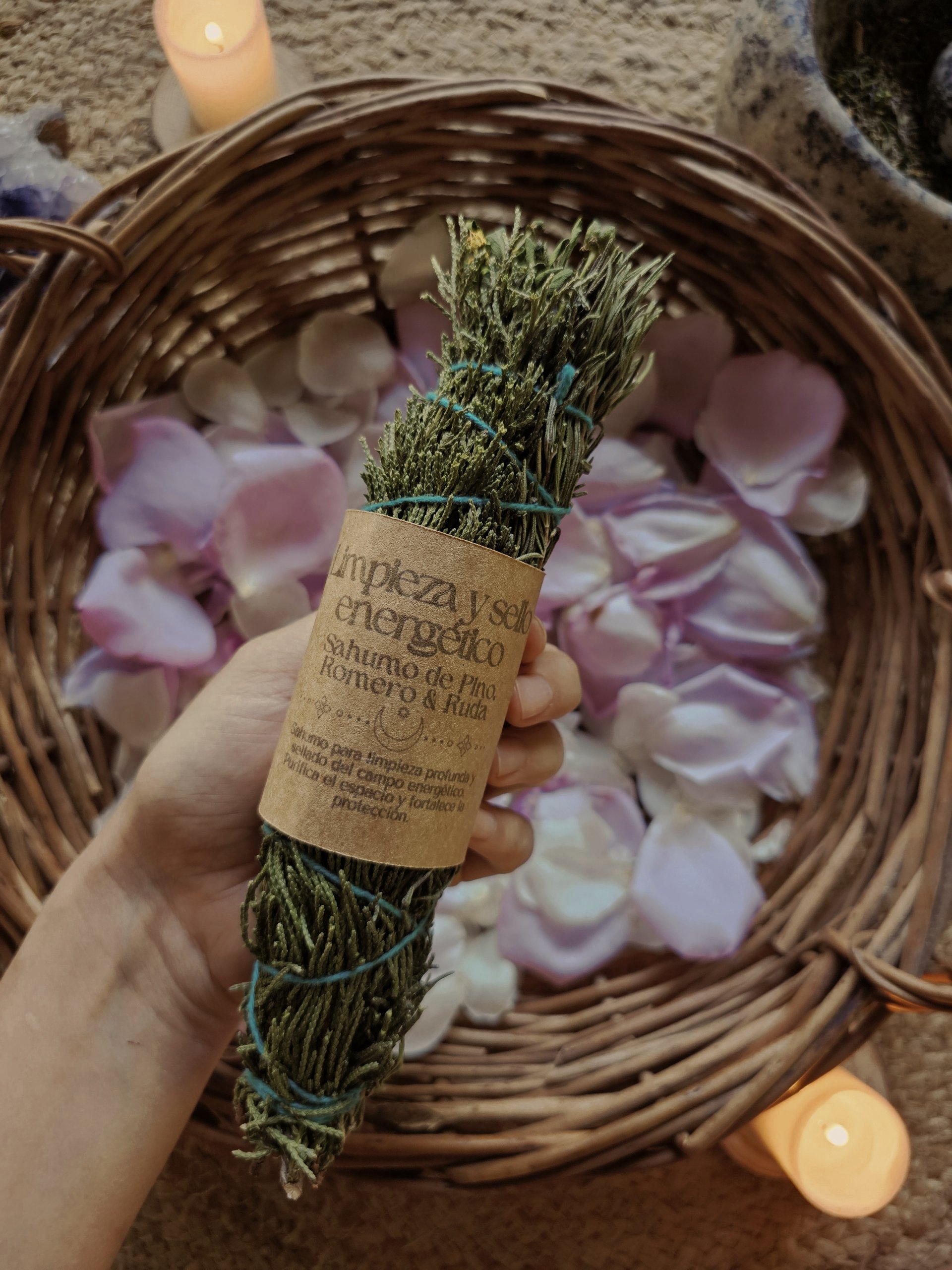 Limpieza y Sello Energético es un sahumo artesanal elaborado con pino, romero y ruda, una combinación poderosa de hierbas tradicionalmente utilizadas para limpiezas profundas, protección y cierre energético.